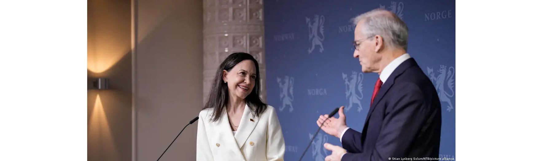 Machado declaró en el Parlamento de Noruega, en rueda de prensa con el primer ministro noruego, Jonas Gahr Støre, que tiene muchas esperanzas de que Venezuela sea "libre" y que pueda dar la bienvenida de nuevo a todos los venezolanos "que han tenido que huir del país".